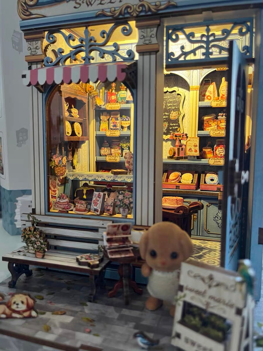 A tiny European-style sweets shop, glowing softly as if it’s just opened for the evening.